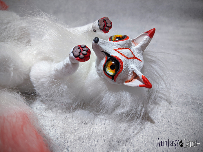 Вся фигурка сделана из полимерной глины. Сверху немного добавлен мех, для образа воздушной и пушистой лисички! Давно хотела совместить это в работе как в своих книжках монстриках)