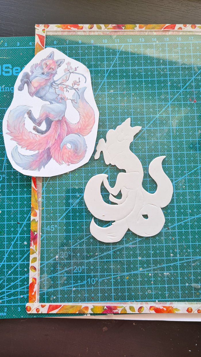 Девятихвостая лисичка Кицунэ в смешанной технике.