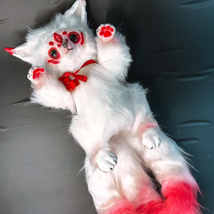 Из искусственного меха, набита синтепоном, в тельце также есть минеральный гранулят для устойчивости. Мордочка, уши и лапки из запекаемой полимерной глины, окрашены акриловыми красками и пастелью, покрыты акриловым лаком. Глаза - стеклянные кабошоны. Имеет шплинтовое крепление лап и головы, за счет которого части тела поворачиваются на 360 градусов; хвосты на проволочном каркасе, за счет которого гнутся в любую форму.