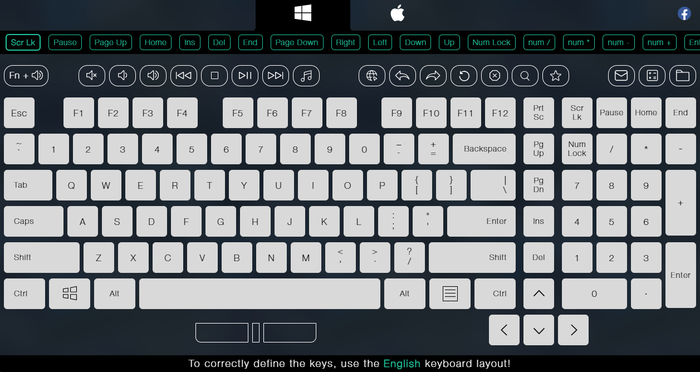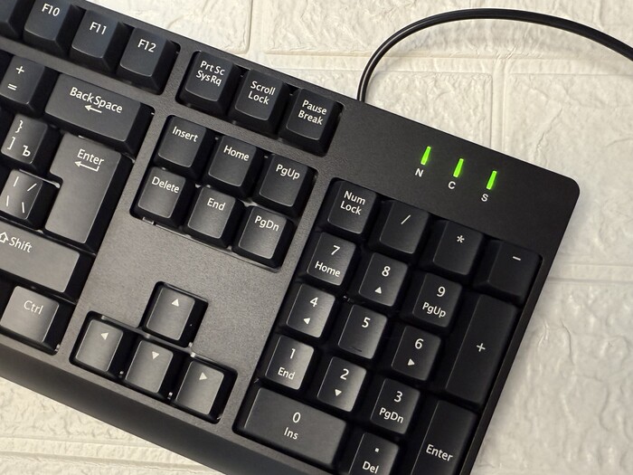 Клавиатура не имеет подсветки, лишь 3 индикатора в правом верхнем углу: режима блокировки цифр (Num Lock), режима прописных букв (Caps Lock), и режима блокировки прокрутки (Scroll Lock)