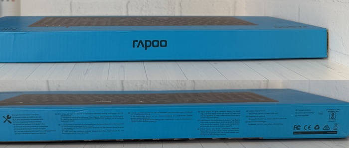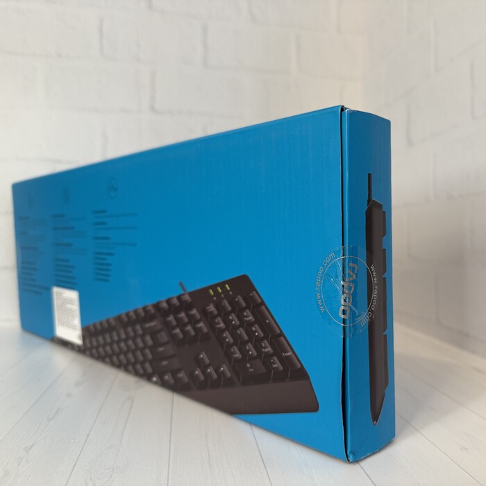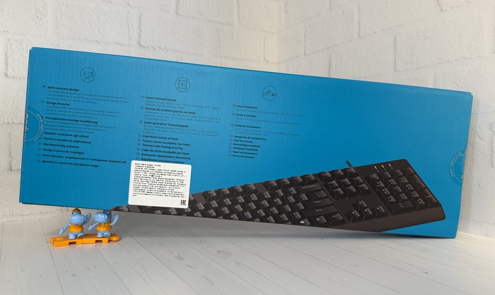 Упаковка представлена в классическом и уже узнаваемом для данной фирмы варианте: картонный бокс синего цвета. На фронтальной стороне коробки сверху по разным сторонам написаны наименования фирмы и модели. Слева имеется небольшой “ребус”, показывающий особенности клавиатуры: защита от залития водой, лазерная гравировка колпачков, простая установка: воткнул USB и готово.