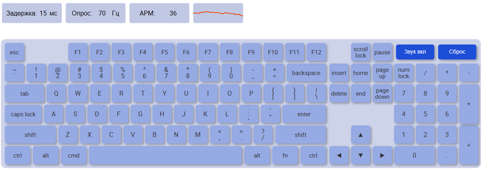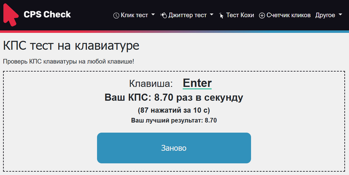 И замерим еще скорость нажатия клавиш (важная характеристика для геймеров): как можно заметить из результатов ниже, в среднем выходит 8 нажатий в секунду.