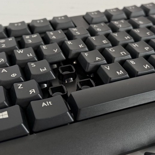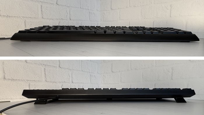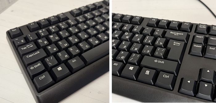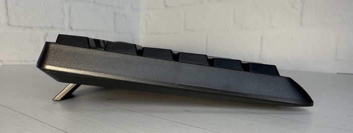 Наклон у клавиатуры при установке на ножки отличный. Клавиши широкие, риск промахнуться минимальный. Ход при нажатии хороший и, что немаловажно, шум от постукивания несильно слышно.