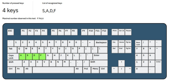 С нажатием одновременно на несколько клавиш интереснее (тестировалась только буквенная часть клавиатуры): больше 4х нажать не удалось, и то это были определенные комбинации: QWER ASDF ZXCV UIOP JKL; M,./