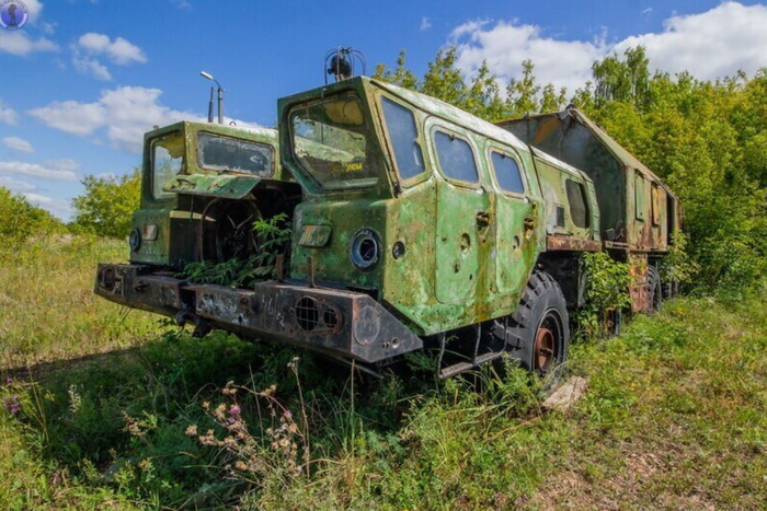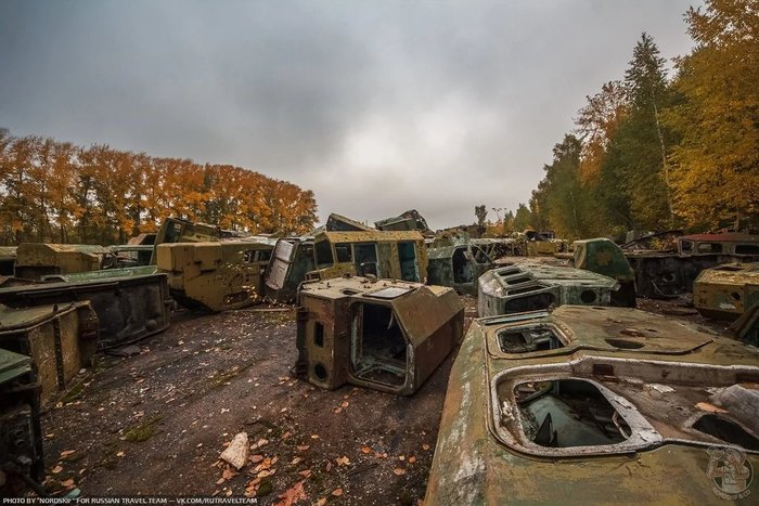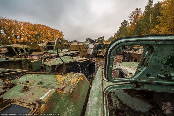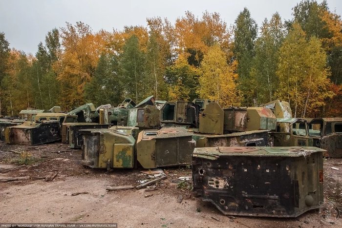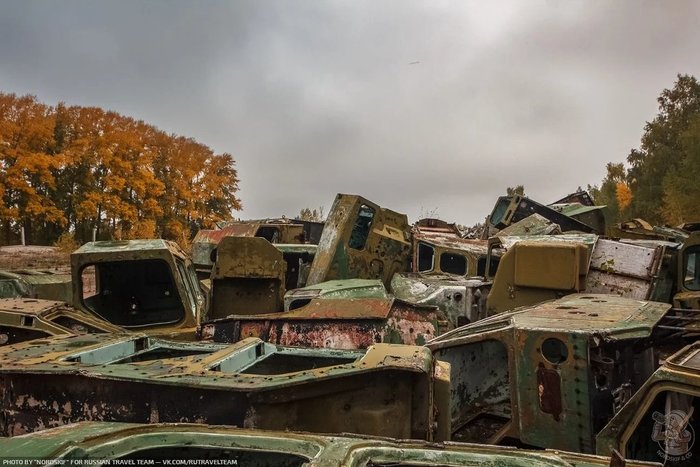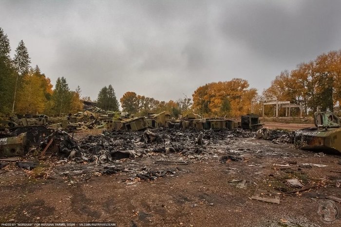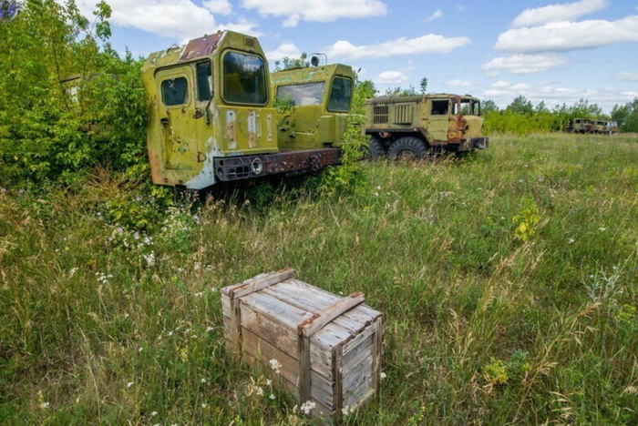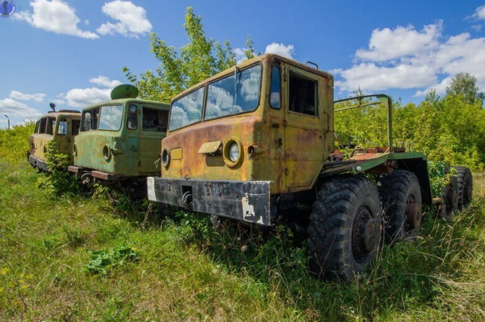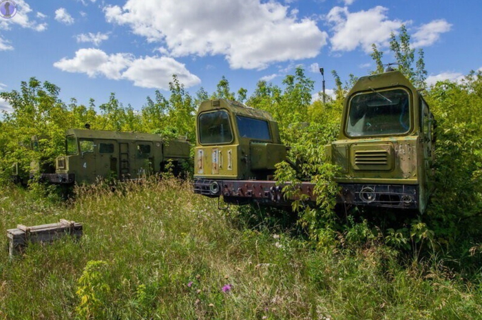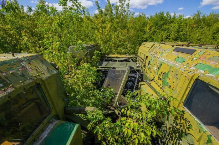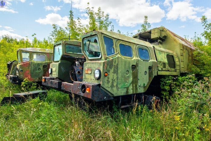 И снова ракетовозы. Возможно среди них есть и останки оперативно-тактических ракетных комплексов "Темп-С", также ликвидированных по договору РСМД. Место реально атмосферное, да ещё и с какой техникой.
