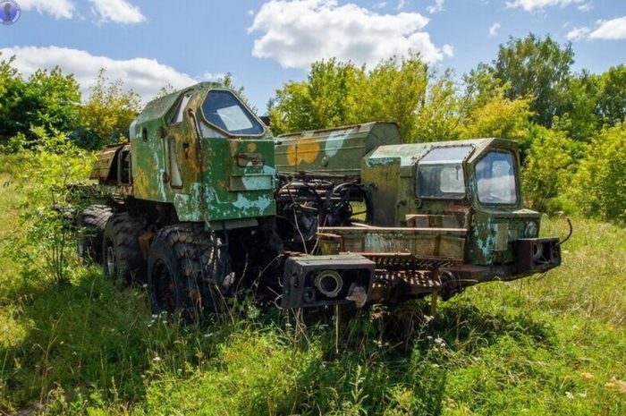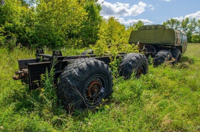 Рядом стоят останки одного из ракетовозов на базе шасси МАЗ-547В.