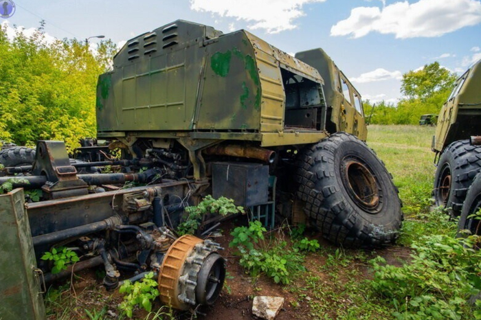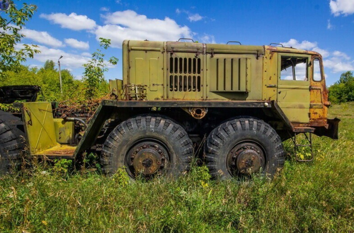 А теперь перейдём к самому интересному. Напротив в кустах стоит ряд останков самих ПГРК и ракетовозов на базе МАЗ-547 нескольких разновидностей, а также другая техника на базе МАЗ-543.