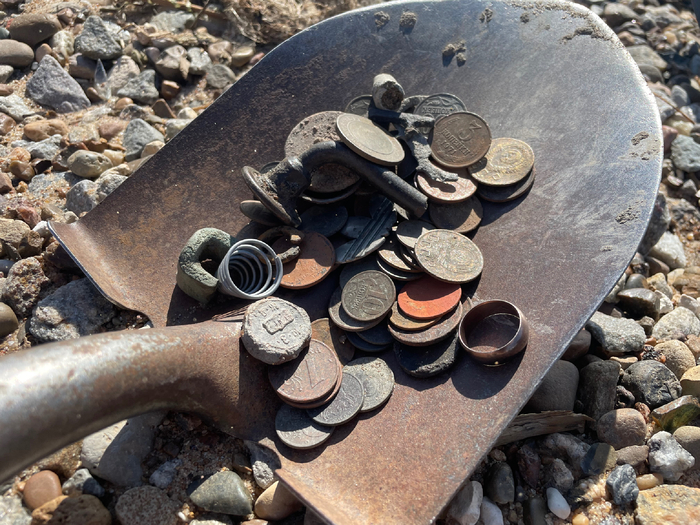 Уровень воды был непривычно высок, но начинался отлив и поэтому я медленно ходила вдоль самой кромки прибоя, вызванивая метр за метром. Почти сразу мне попались 5 копеек 1937 года и рядом позднесоветский трюндель. Но добывая их из каменистого прибрежного грунта я поняла опрометчивость своего решения копать с детской лопаткой. Чтобы отковырять слежавшиеся в иле булыжники пришлось найти сухую ветку и отковыривать камни ей. Так себе удовольствие, я вам доложу!