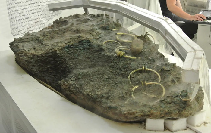 Тайник находился под землей. Деньги спрятали кельты в 50 году до н.э. в ожидании наступления римлян. Монетки за все время плотно слежались. Теперь это сплошной огромный слиток, который поднимали подъемным краном. «Слиток» оценивают примерно в $5-17 млн.