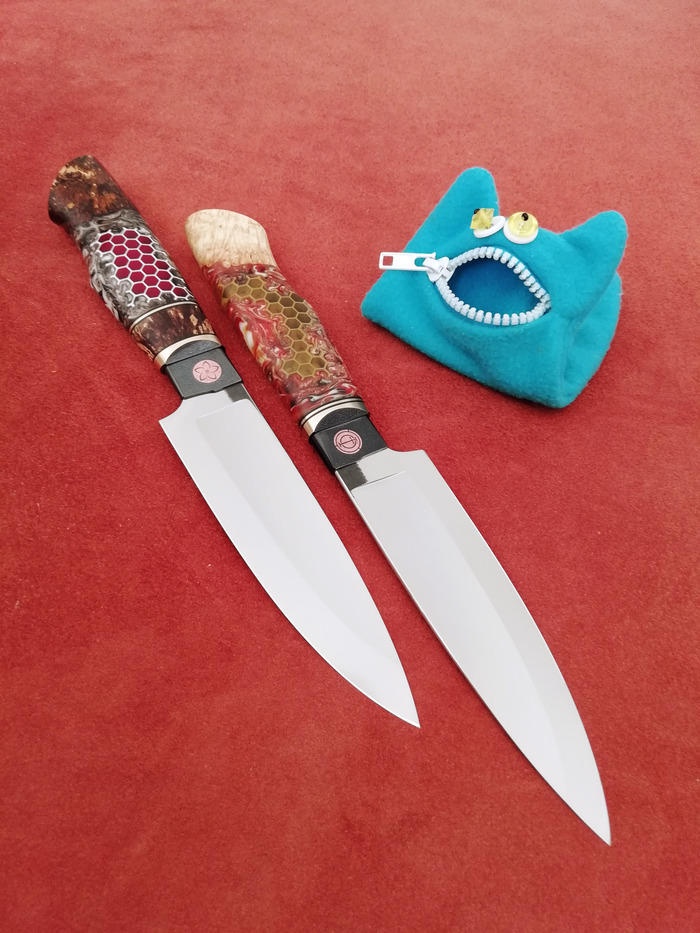 Недавно был заказ на пару почти идентичных кухонных универсалов с забавным материалом на рукоятях. Оба выполнены из RWL34 (62-63 HRC) и с S-образными спусками, но с некоторыми различиями.