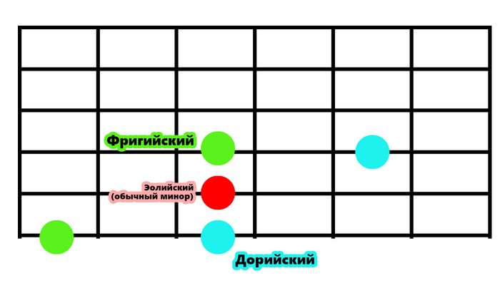 Если вам надо сыграть дорийский лад, например, в ля, ищете эту ноту и играете минорную гамму на струну толще (на кварту вверх) или на струну тоньше через лад в сторону бриджа (на квинту вниз)
