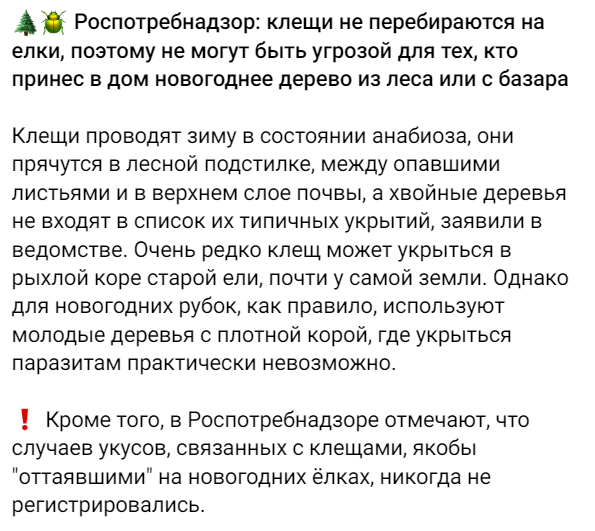 И главное: истории про «клещей на новогодних ёлках» это не фейк, но и не повод для паники. Это обычная биология. Конечно, живая ёлка остаётся тем же символом праздника, каким была всегда, просто иногда она напоминает, что пришла к нам из настоящего леса.
