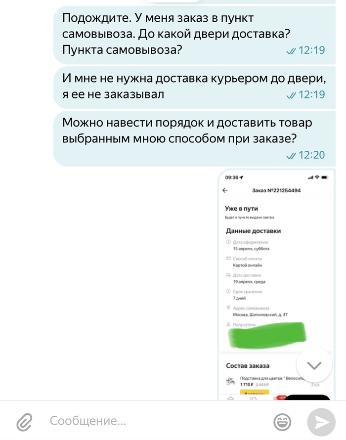 Подъезжаем мы к дому, никаких посторонних людей или незнакомых машин во дворе нет. До окончания "в течение часа" ещё минут 15-20. Звоню курьеру, мол, я приехала, вы где? И получаю в ответ то, что просто лишает меня дара речи: я не намерен вас ждать, я уехал. Охренев от такого поворота я только и смогла сказать: в смысле? Курьер начал втирать, что делать ему нечего, стоять и ждать меня 20 минут, у него нет времени, это мои проблемы, что меня не было. Мои слова о том, что я условие "в течение часа" выполнила, а он не выполняет свою работу, даже слушать не стал. Единственный аргумент его был: я же сказал в течение часа, а не через час. Я так понимаю, если указан диапазон с 10 до 22, клиент не может никуда отлучиться из дома, тк в любой момент курьер может приехать и будет прав, если клиента не окажется дома. В общем, после таких аргументов мой дар речи ко мне вернулся, уже на повышенных тонах я пыталась донести, что так не делается, что мне из-за него пришлось изменить маршрут и в срочном порядке ехать домой, что вручать заказ клиенту это его работа, с которой он не справляется. Курьер начал кричать в ответ, что ему пофиг, сказал "все" и бросил трубку. Такое отношение я встретила впервые. Учитывая, что большую часть жизни я работала с клиентами, знаю, как должен сотрудник вести диалог, мое офигевание зашкаливало. Заказ на копеечную сумму, но это уже дело принципа.