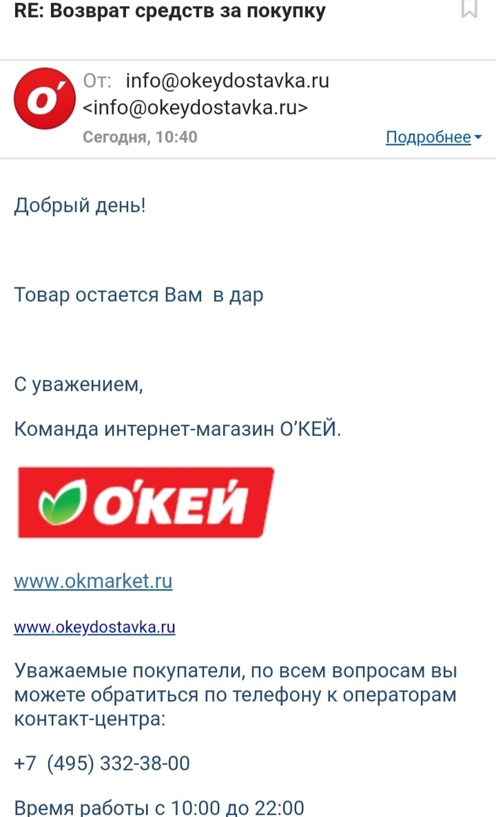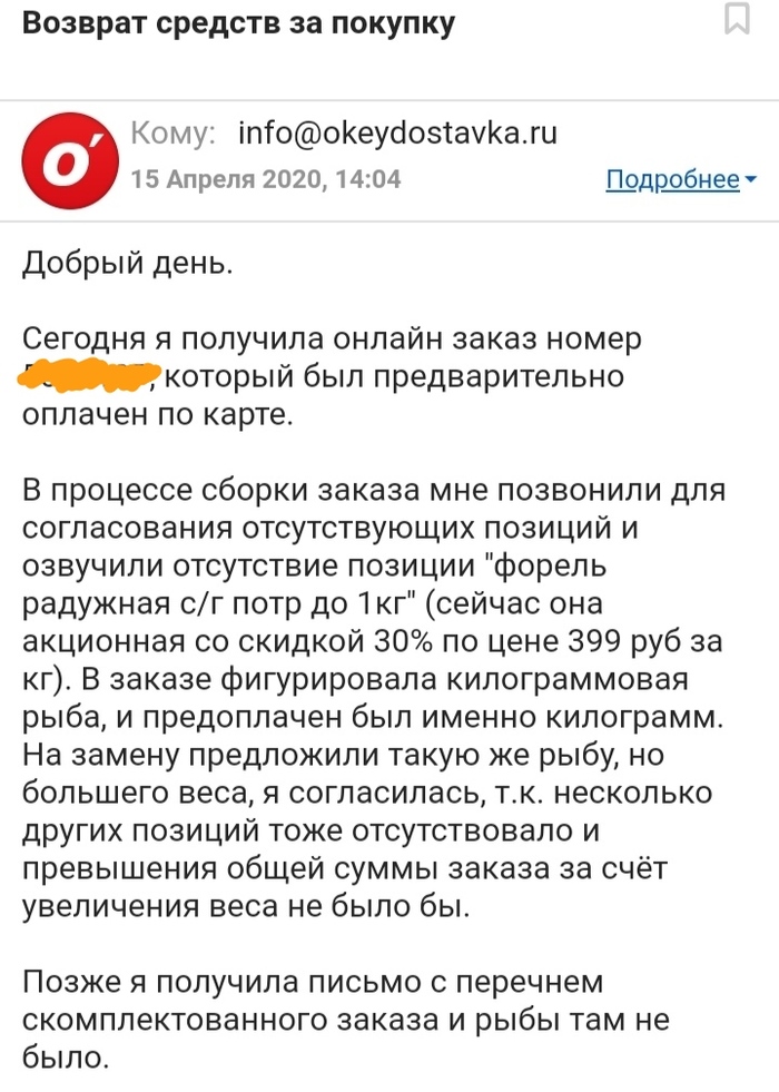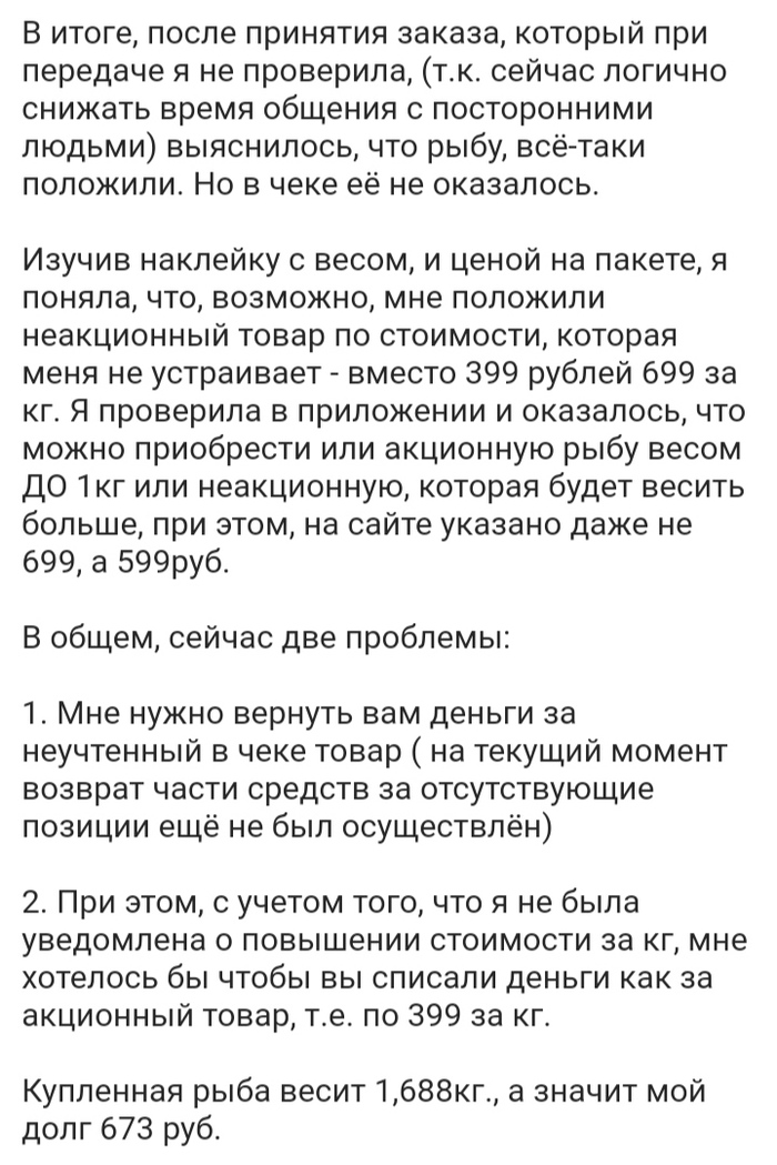 Не буду дублировать весь рассказ, подробности которого в письме, прикреплённом ниже, просто скажу, что после получения, отъезда курьера, я, все же решила не просто разобрать, но сверить все продукты, т.к. в это раз потраченная сумма была посерьезнее предыдущих. Я обнаружила, что рыбу привезли, а в чек её не включили. Ещё раз всё проверила и накладную и чек. Не было рыбы. Я решила позвонить и оповестить их об этом. Позвонила, начала рассказывать, но, видимо, отдел был не тот, поэтому мне сказали, что переключат на инет магазин. Меня переключили и начались гудки. Но т.к. звонила не на горячую линию, то решила не тратить деньги и перезвонить попозже на 8 800. А потом и вовсе написала им письмо, ведь именно так проще всего было объяснить произошедшую ситуацию: