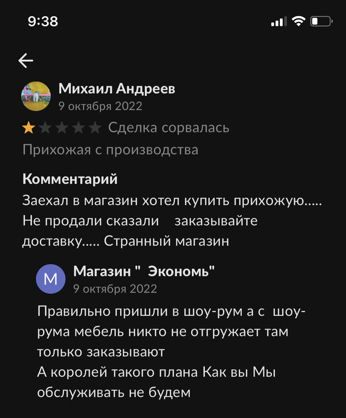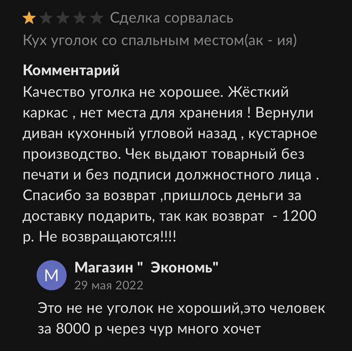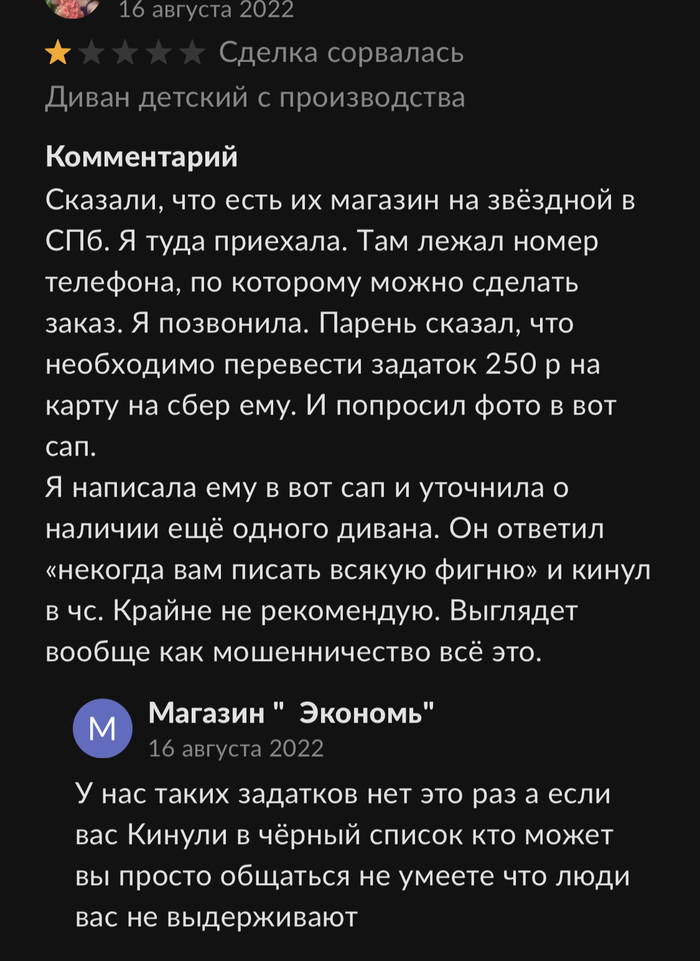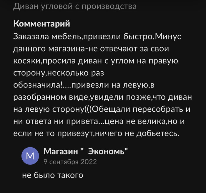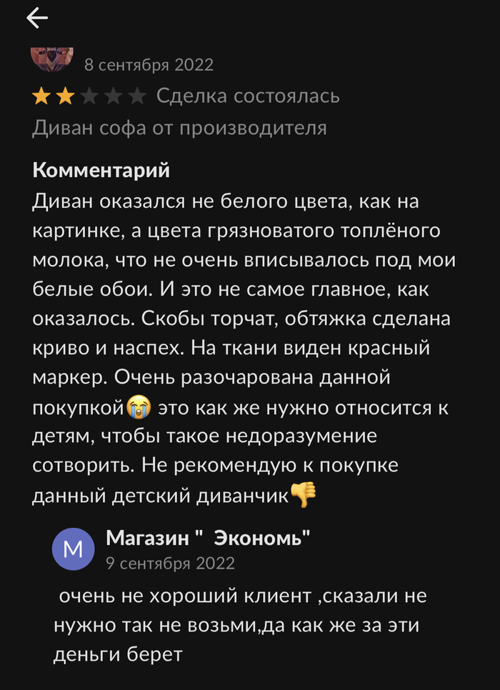 Ищу диван на Авито. Наткнулась на один мебельный магазин. Разумеется, сначала читаю отзывы. Так вот, когда я ранее встречала подобные ответы продавца на скриншотах в инете, думала, ну не бывает так, это фейк. Оказывается, бывает. Испанский стыд🤦♀️ (там ещё и с русским языком проблемы)