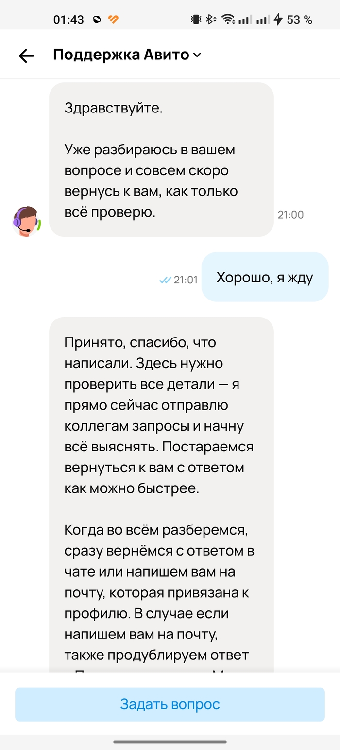 Из чата кажется, что со мной общается бот, либо же у них проходит голосование в три тура по поводу принятия моего объявления. Либо же оно настолько сложное, что справиться с ним за один день не получается, и для него организовали специальную секретную лабораторию для изучения.