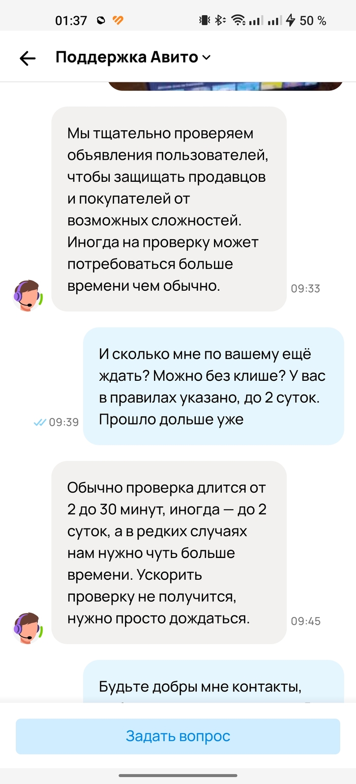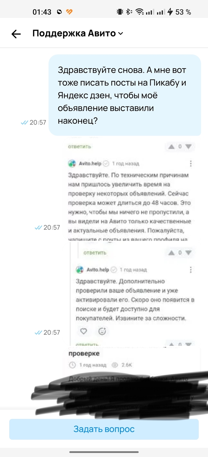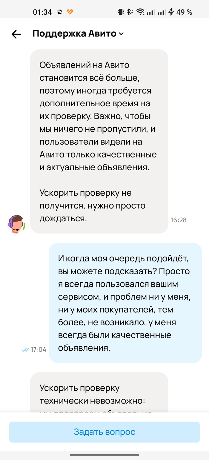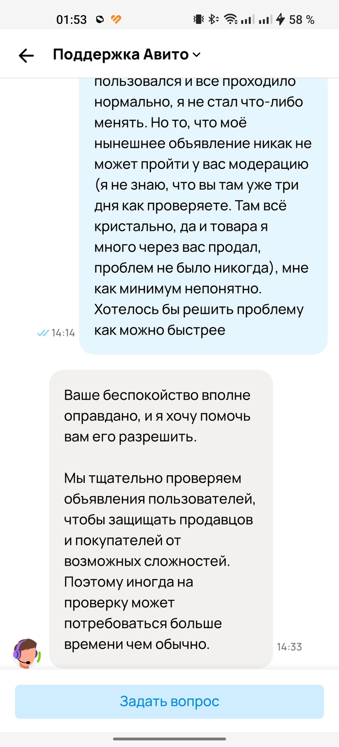 Если в чём-то не согласны, вы в праве это подчеркнуть. Далее, когда ожидание мне наскучило, я вроде не табуретку за 300 рублей продаю (хотя забавно было бы, если и такие объявления застревают "на проверке"), контрабандой тоже не занимаюсь, сверх технологических инноваций на продажу в объявлении нет, пошёл на просторы интернета, в поисках подобных ситуаций. Наткнулся на пост Пикабу, где человек ждал месяц, когда опубликуют его объявление, далее вот: