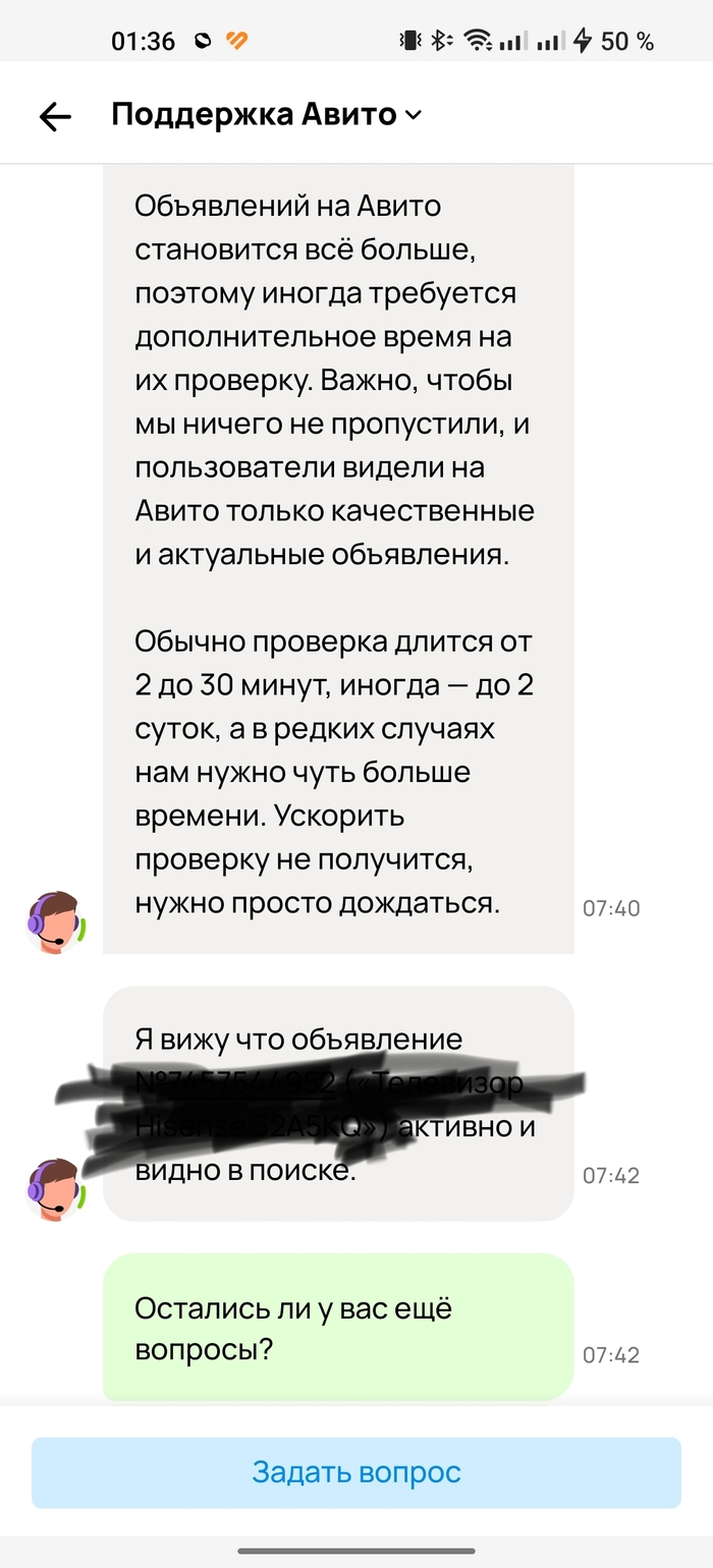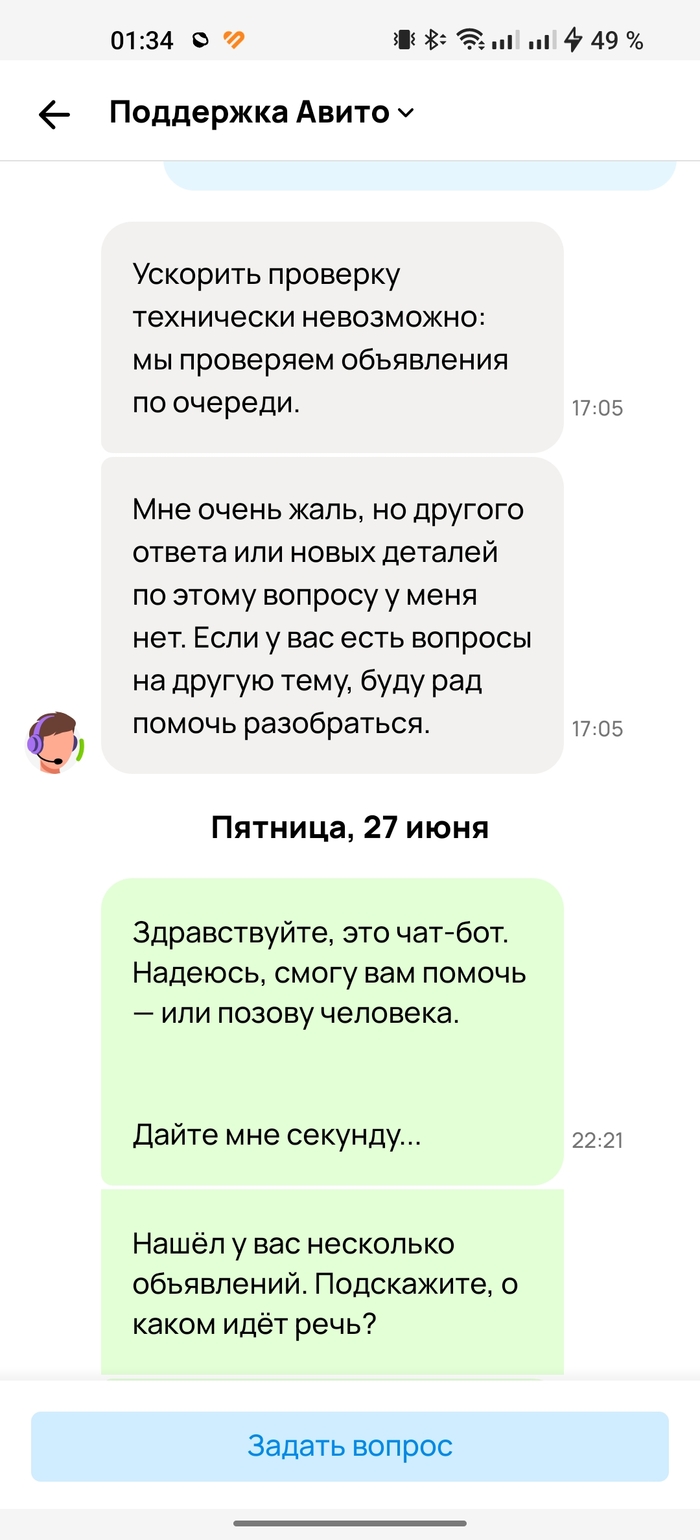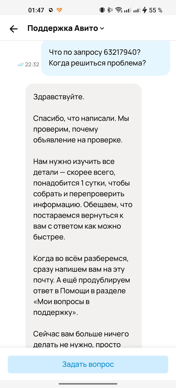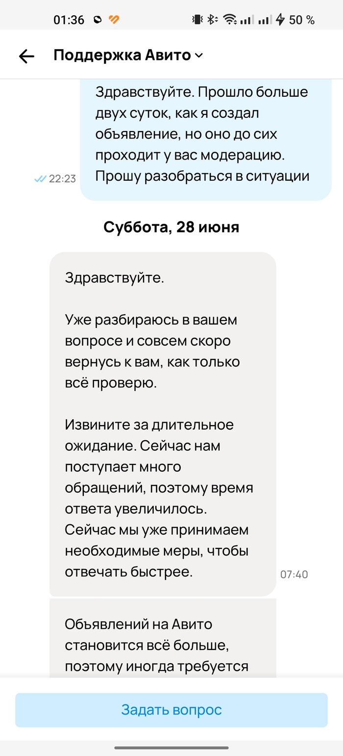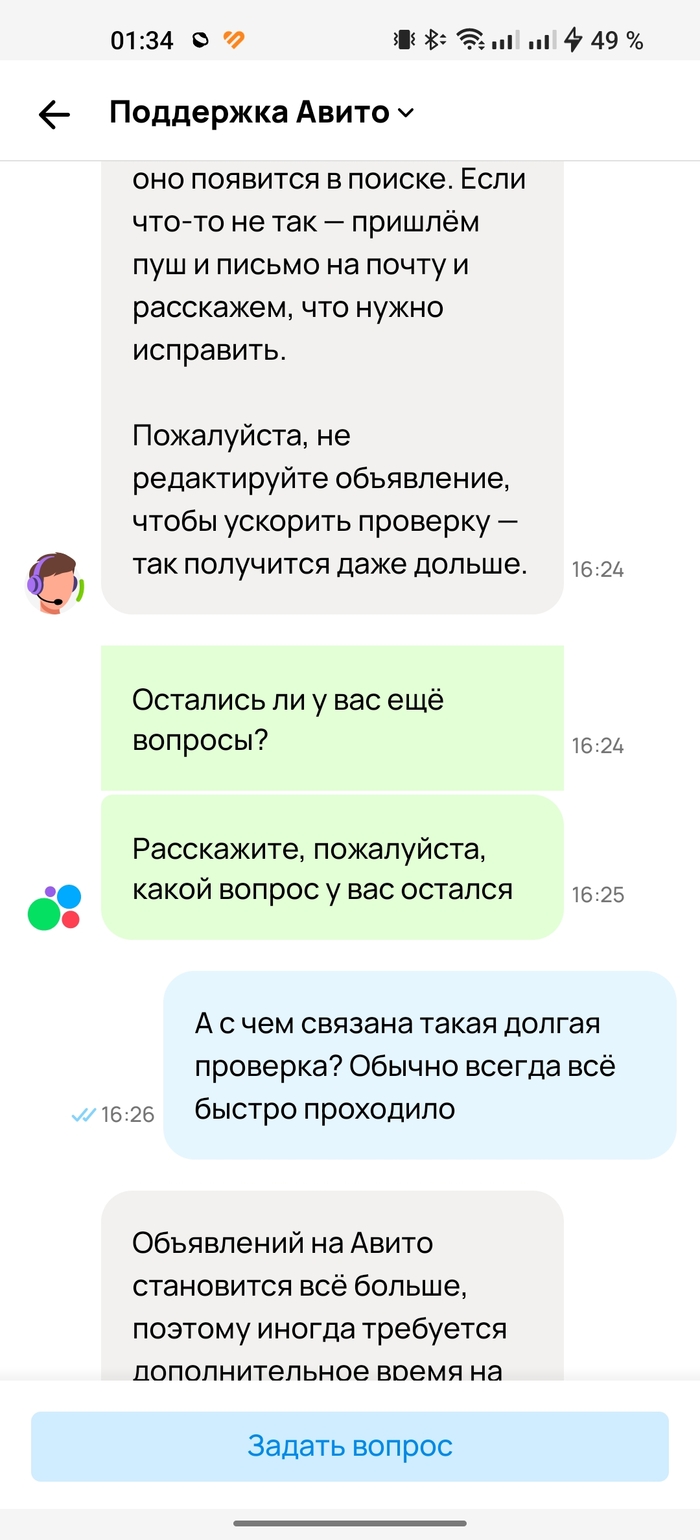 Если в чём-то не согласны, вы в праве это подчеркнуть. Далее, когда ожидание мне наскучило, я вроде не табуретку за 300 рублей продаю (хотя забавно было бы, если и такие объявления застревают "на проверке"), контрабандой тоже не занимаюсь, сверх технологических инноваций на продажу в объявлении нет, пошёл на просторы интернета, в поисках подобных ситуаций. Наткнулся на пост Пикабу, где человек ждал месяц, когда опубликуют его объявление, далее вот: