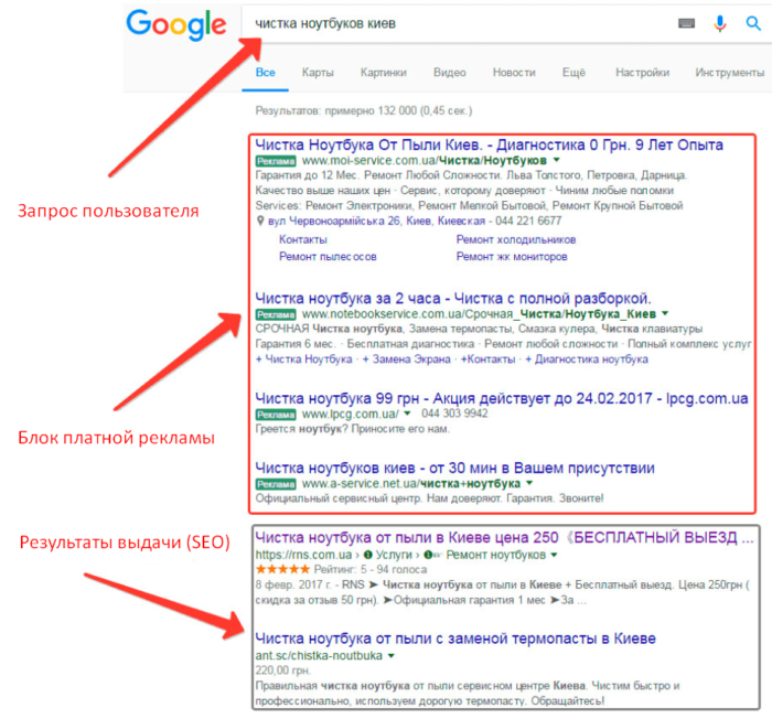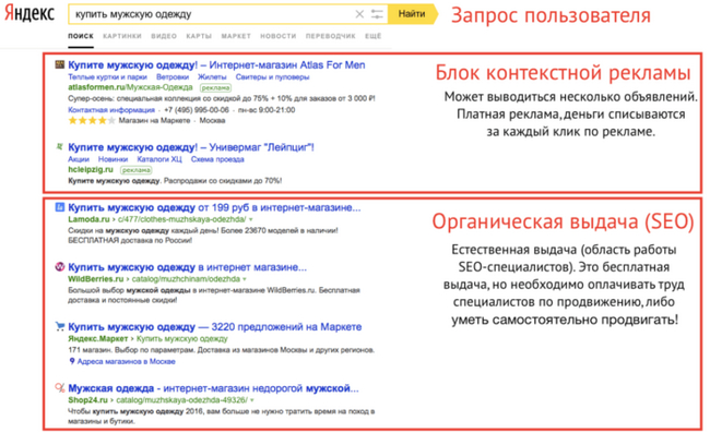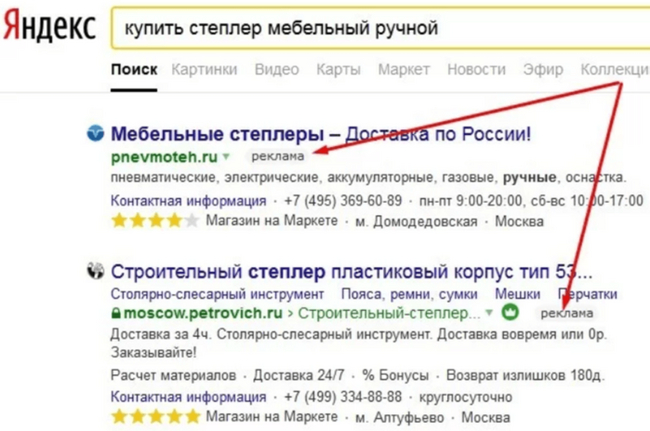 Контекстная реклама — это вид интернет-рекламы, который показывается пользователю в результатах выдачи после того, как он введет в поисковую строку Google/Яндекс свой запрос и нажмет кнопку «найти». В результатах выдачи, рекламу можно будет увидеть в двух местах: под поисковой строкой и в футере (конец результатов выдачи).