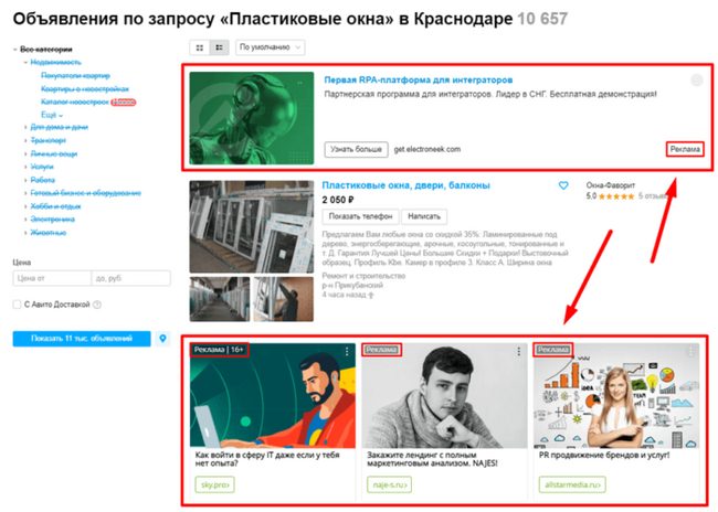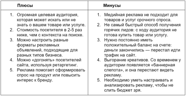 Особенности: по объявлениям приходит менее «теплая аудитория», чем по контекстной рекламе на поиске. Аудитория может интересоваться товаром/услугой, но не оформлять заказ сразу. Оплата объявления происходит за клик по принципу аукциона (цена клика напрямую зависит от количества рекламодателей, рекламирующихся в одно время).