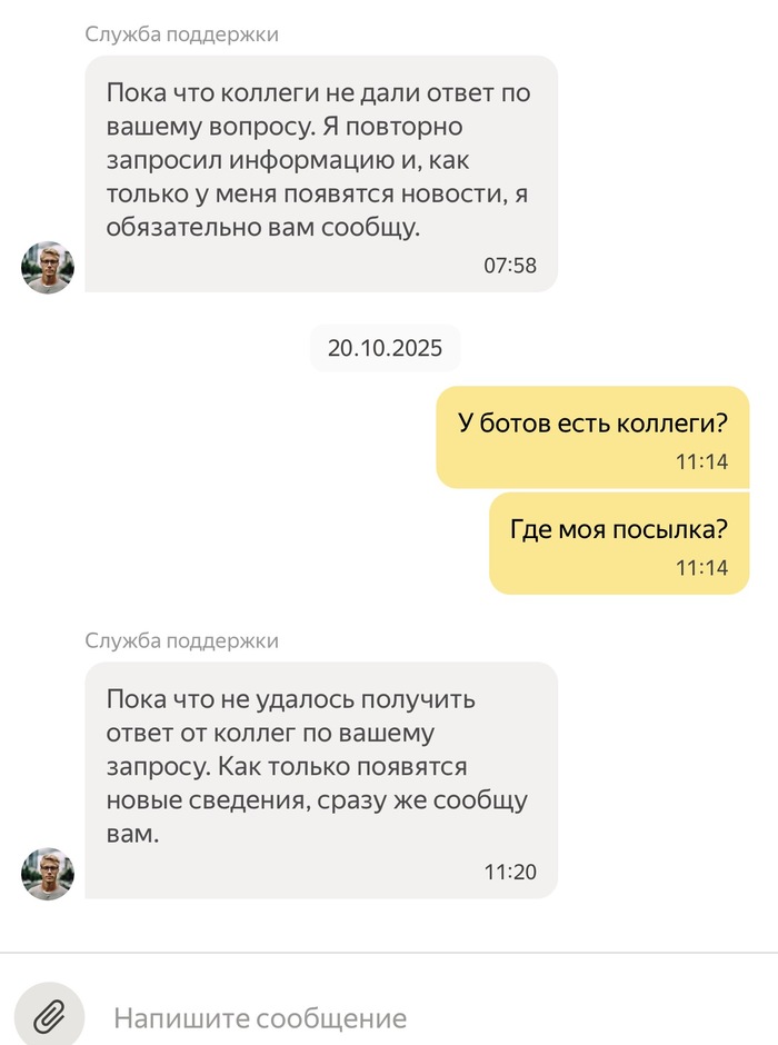 Яндекс молчит. Пишу. Жду ответа. Тишина. Спрашиваю, где же моя посылка?! Яндекс путается в собственных шаблонных ответах и снова отсылает меня в Авито.