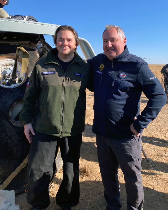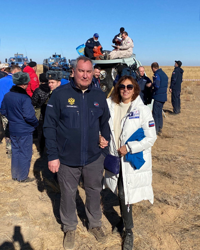 Дмитрий и Татьяна Рогозины рядом со спускаемым аппаратом корабля «Союз МС-18», на котором вернулся «киноэкипаж». На заднем плане можно разглядеть знаменитые машины ЗИЛ-49061 «Синяя птица» для поиска и спасения космонавтов. Около спускаемого аппарата стоит космонавт Олег Котов, дающий интервью от ИМБП. Фото: Татьяна Рогозина