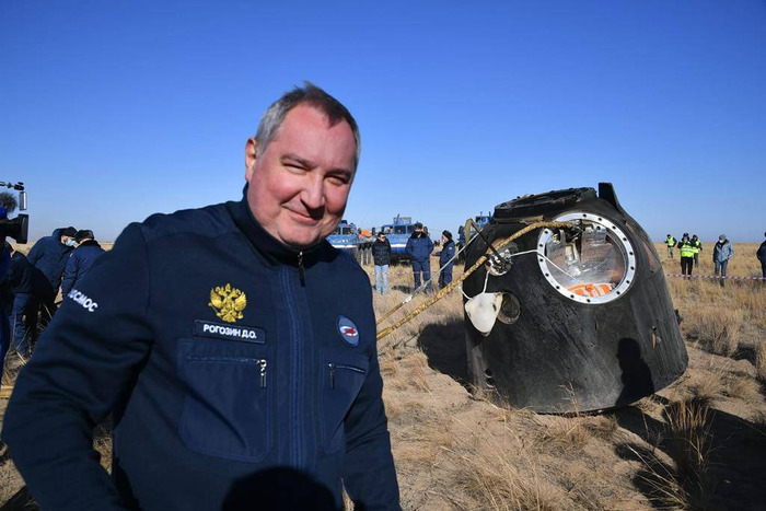 Дмитрий Рогозин у спускаемого аппарата корабля «Союз МС-18» с безопасной от радиации стороны. Фото: Татьяна Рогозина