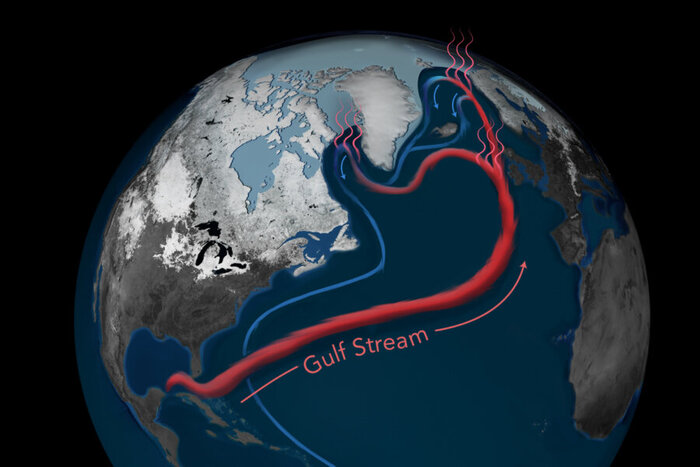 Тепло уносится от экватора течениями и преобладающими ветрами. В океанах работает «Атлантическая меридиональная циркуляция» (АМЦ), которая с помощью Гольфстрима переправляет к Гренландии разогретую соленую воду, а вместе с ней кислород и питательные вещества. Когда АМЦ сильна, в Северном полушарии становится теплее, и наоборот. Следует отметить, что климатический кризис последних десятилетий усугубляет обозначенную выше диспропорцию. Дело в том, что морской ледяной панцирь Арктики тает быстрее, чем тот, который находится на суше в Антарктиде. Это приводит к формированию петли обратной связи, так как Северное полушарие отражает все меньше тепла и нагревается быстрее.