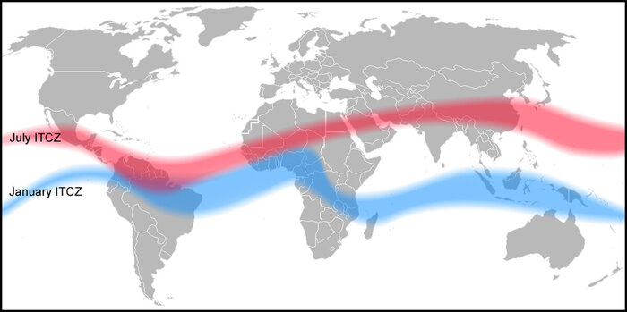 Поначалу предполагалось, что это происходит благодаря границе, которая называется «внутритропической зоной конвергенции» (ITCZ). Это пояс низкого давления, проходящий примерно по экватору. Он естественным образом ненамного смещается к северу или югу и несет ответственность за погодные условия в зоне своего расположения. По крайней мере, обильные дожди – это его работа. Ветрам трудно пробиваться через ITCZ, поэтому было выдвинуто предположение, что именно эта зона удерживает загрязнение в Северном полушарии.