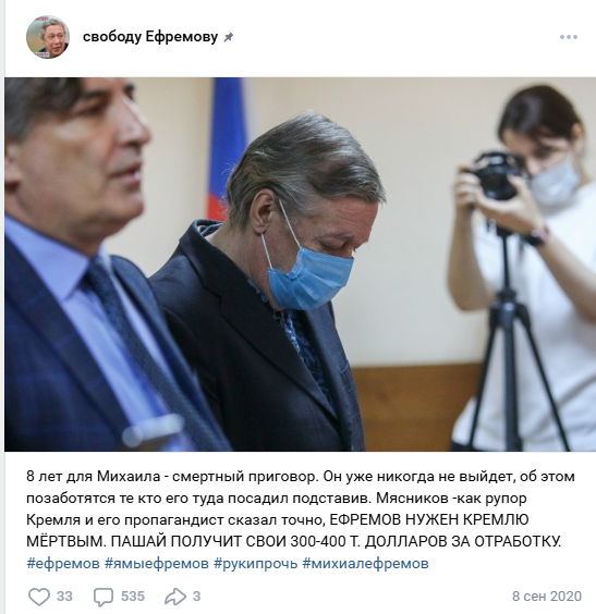 Если кто не в курсе, то после того как актер Ефремов, был арестован после ДТП со смертельным исходом, в интернете поднялся натуральный вой, (скриншот выше, лишь отголосок от этого вой достойного собаке Баскервилей), что актера подставили, за критику российской власти, авария была подстроена, сам Ефремов за рулем не находился и все такое. И да, из Ефремова тогда стали лепить этакую жертву политических репрессий.