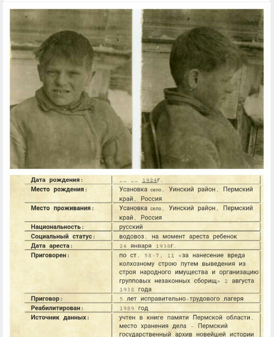 О друзьях-«вредителях» вспомнили зимой. Их арестовали 24 января 1938 года. Так Гриша оказался в тюрьме городка Кунгур, где в течение восьми месяцев ломал голову над тем, в чем он повинен перед родной советской властью. В бумаге, предъявленной мальчишке в августе 1938-го, значилось, что он осужден сроком на пять лет по грозной политической статье 58-7,11 «за нанесение вреда колхозному строю путем выведения из строя народного имущества и организацию групповых незаконных сборищ»."