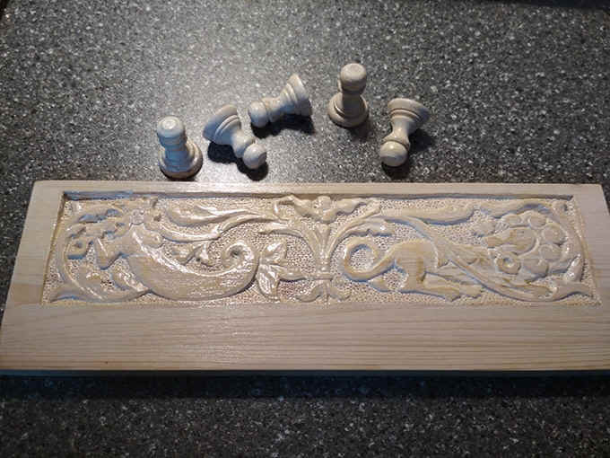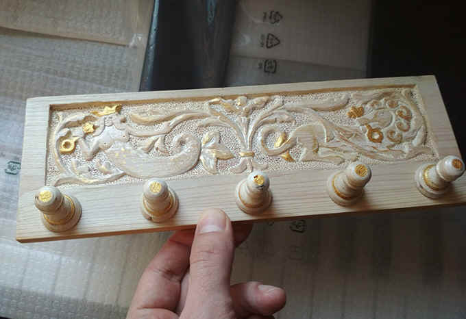 Запилил вешалку для ключей. Как обычно, пытаюсь замесить русский стиль с махровым ренессансом. Древесина основы — сосна, пешечки — береза. Сосна для резьбы — тест на осторожность и терпение )))