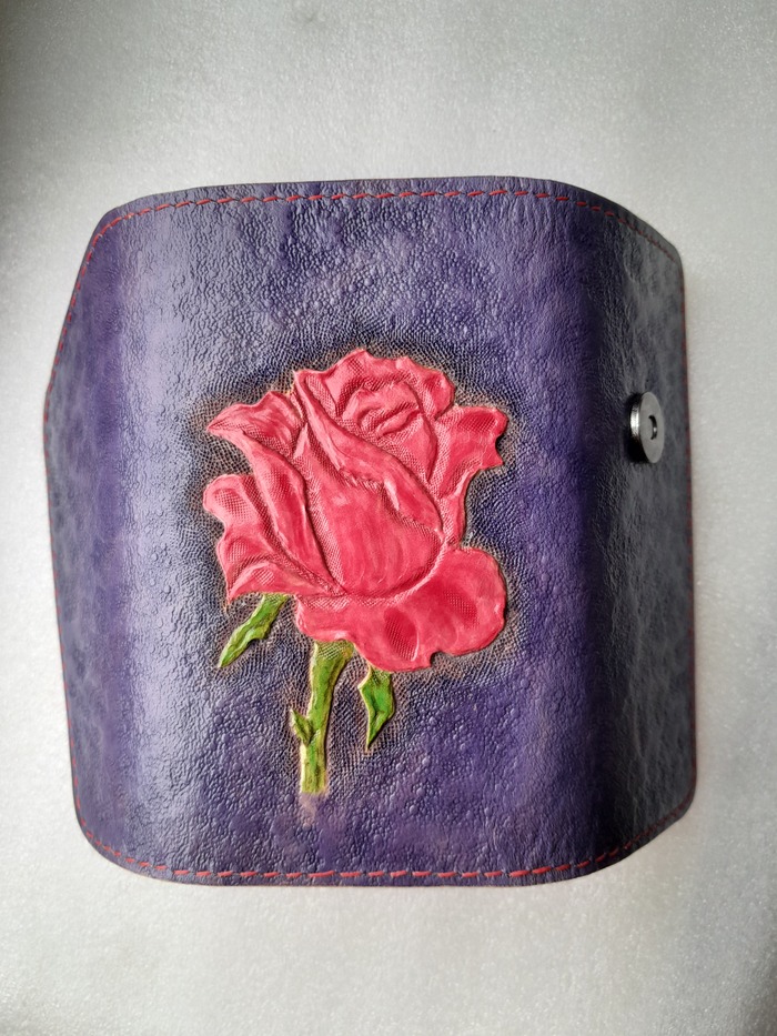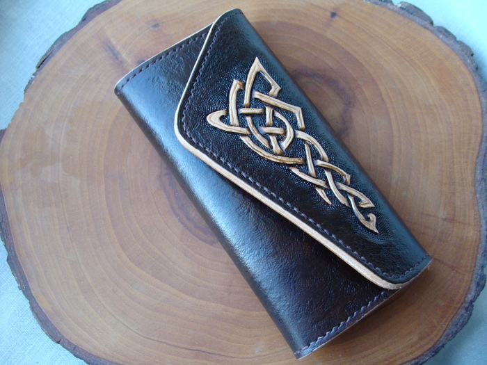 Так вот, здесь из специального инструмента были только строчные пробойники. Кожа пошла из голенищ старых сапог, клей момент, нитки для рукоделия льняные, вощила их сама, Установку кнопки и хольнитенов для прикрепления внутренней фурнитуры попробовала сделать молотком и демонтировала это убожество, сделала в ларьке на прессе. Прослезилась, сколько это стоит. Задумалась о приобретении пресса, пускай и попроще. Ну, и завертелось. Вот следующая ключница, для мамы, это уже, наверное, четвёртое моё изделие, попробовала на нём укрывные урезы и тиснение.