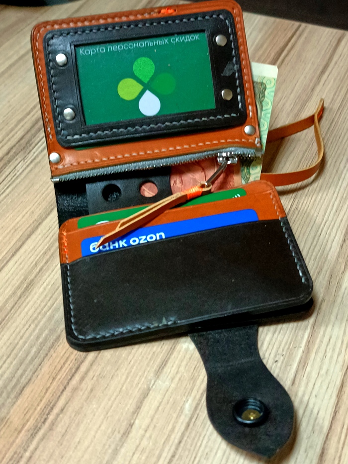 Вообще я сначала делал маленький кошелёк для мелочи, а потом уже прикрепил картхолдер, добавил обложку, ну шью по ночам, один в темном большом помещении, сказывается на дизайне.