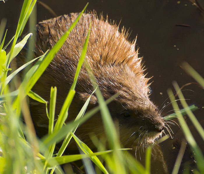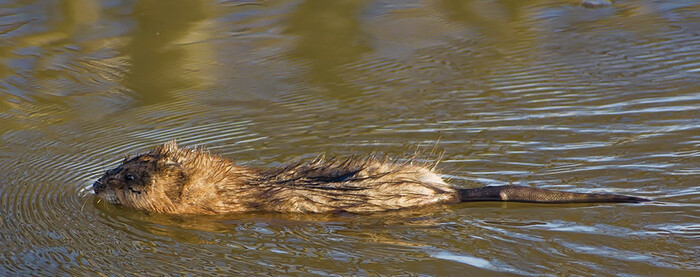 Селезень кряквы прогоняет ондатру.