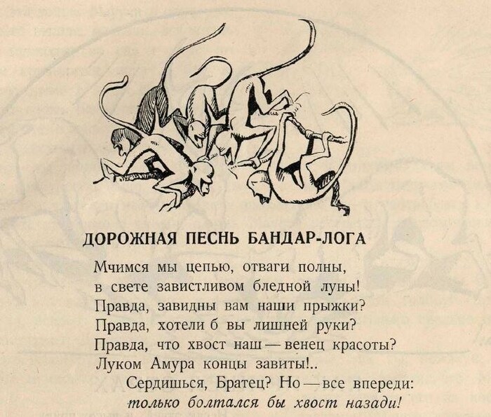 В своем обличении Киплинг не ограничился прозой, и вставил в книгу большое стихотворение "Дорожная песня бандерлогов" (которое, как другие стихи, из русских переводов "Книги джунглей" почему-то всегда выбрасывают).