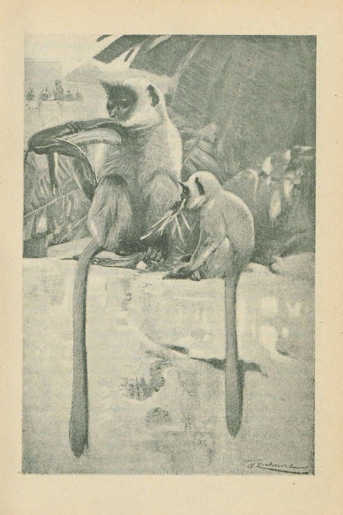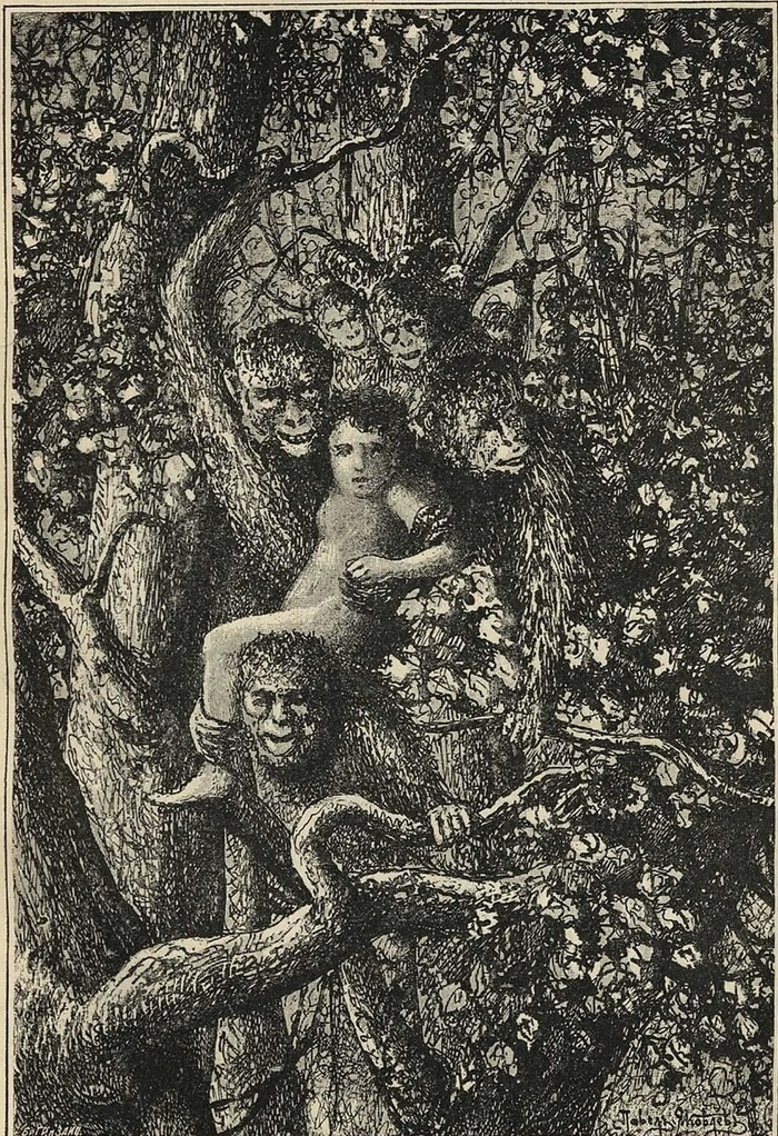 "Балу говорил про обезьян сущую правду. Они жили на вершинах деревьев, а так как звери редко смотрят вверх, то обезьянам и Народу Джунглей не приходилось встречаться. Но если обезьянам попадался в руки больной волк, или раненый тигр, или медведь, они мучили слабых и забавы ради бросали в зверей палками и орехами, надеясь, что их заметят. Они поднимали вой, выкрикивая бессмысленные песни, звали Народ Джунглей к себе на деревья драться, заводили из-за пустяков ссоры между собой и бросали мёртвых обезьян где попало, напоказ всему Народу Джунглей. Они постоянно собирались завести и своего вожака, и свои законы и обычаи, но так и не завели, потому что память у них была короткая, не дальше вчерашнего дня. В конце концов они помирились на том, что придумали поговорку: «Все джунгли будут думать завтра так, как обезьяны думают сегодня», и очень этим утешались".