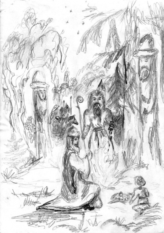 Все быстро собрались – женщина с мальчиком, охрана, волхв со своим учеником – и ушли по тропинке в горы. Они взяли с собой какие-то свитки и деревянные плашки. Выкопали также одного из идолов. Он глубоко врос корнями в землю (был вытесан из засохшего на корню дерева) и никак не хотел покидать свое родное место. Женщину и мальчика посадили на одну лошадь, мальчика – спереди.