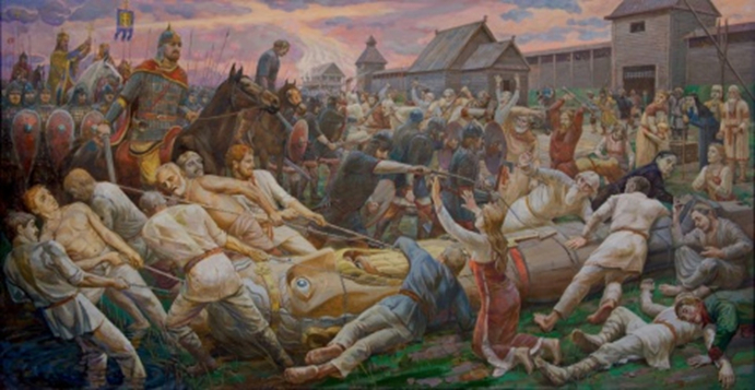 А вот другой «кадр»: волоком тащат вниз деревянных идолов и разрубают им лица, уничтожают древние дощечки с преданиями и историей Руси. «Гонцы Владимира были отправлены во все концы, чтобы истребить все остатки прошлого, а вместо древней истории писалась новая», - продолжал говорить Перун.