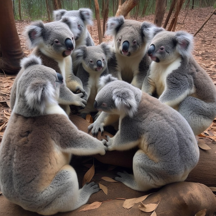 Настала очередь кенгуру. Как начал он прыгать! Через самые высокие деревья перепрыгивает, подскакивает чуть ли не до облаков. Прыгал-прыгал, устал, усмехнулся самодовольно и тоже присел у костра. Пришел черед коалы. Он взобрался на вершину самого высокого эвкалипта и, хотя ветер вовсю раскачивал тонкие ветви, за которые цепко держался коала, принялся неторопливо объедать листочки. Ветер, видно, нисколько его не пугал. Коала наелся досыта, спустился вниз, с победоносным видом посмотрел на противников и опустился около костра.