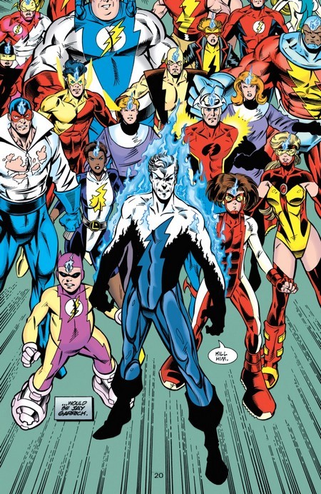А миссия Флэшей продолжается – скороходы бегают по таймлайну, предупреждают других скороходов и побеждают Кобальтов. Импульс в компании Эксес (внучки Барри Аллена) и Кид Флэша (дочки Уолли Уэста) отправляются в 30 век, чтобы защитить самого Барри Аллена – перед тем, как погибнуть во время Кризиса на Бесконечных Землях, Барри некоторое время прожил в 30 веке. Вскоре туда прибегает и Уолли, и видит страшную картину – скороходы бьют совершенно посторонних людей, а возглавляет их Малкольм Тоун в теле Джея Гаррика! Малкольм объясняет, что это всё было его планом. Он может брать под контроль людей, которые завладевают его сапфировым амулетом…а теперь осколками этого амулета владеют пара дюжин Флэшей различных эпох! Джея Гаррика Тоун взял под контроль раньше всех – именно под его контролем Джей предложил расщепить кобальтовый амулет на осколки для поиска остальных скороходов. Во засада! Толпа скороходов избивает Уолли в мясо – но ему на помощь, как молния, раскалывающая тьму, приходит его бывший наставник – Барри Аллен!