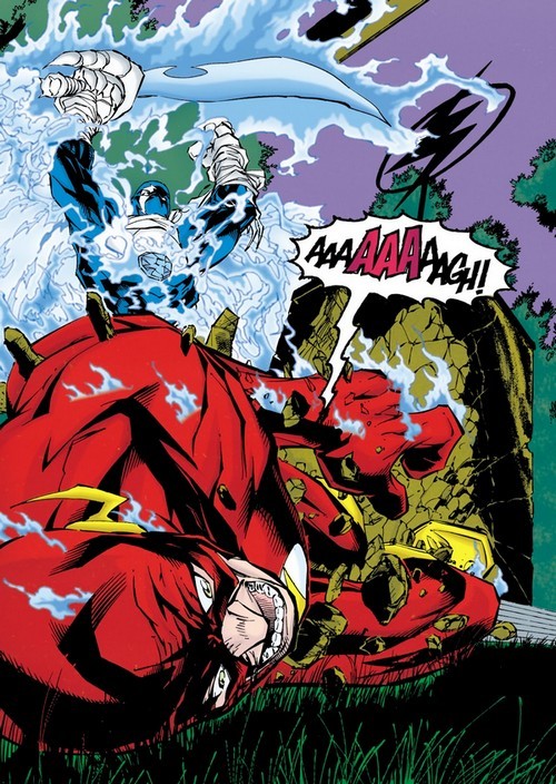 Ух что будет…и будет это в комиксе The Flash #148 за май 1999 года. Напряжение не спадает, Профессор Зум и Уолли Уэст бегут наперегонки к кристаллу Кобальта Синего. Нельзя дать Эобарду завладеть кристаллом, ведь если ненависть Обратного Флэша сольётся с яростью синего пламени, Кобальт станет непобедим! Тут уж не до мягкого подхода – Уолли ускоряется и своей вибрацией уничтожает амулет, после чего вырубает Обратного Флэша и возвращает его в 25 век, в тюрячку. А в настоящем времени Малкольм Тоун валяется без сознания – мёртвый, но живой. Пошарудив hукой в его голове, Джей Гаррик привёл мозг Малкольма в полную непригодность, устроив ему аневризму. Мамкины каратели сказали бы, что Джей молодец, но по факту Джей совершил преступление, и полиция собирается его арестовать.