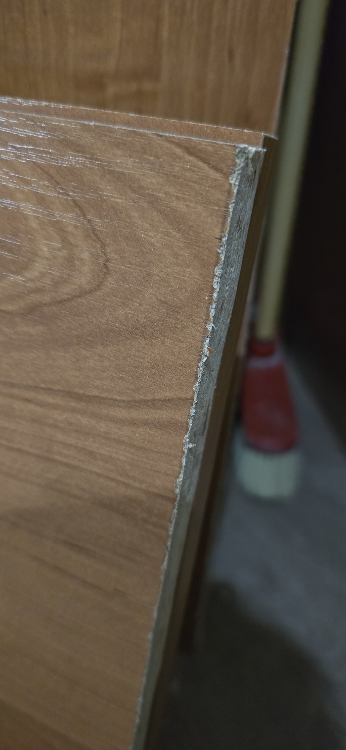 Ещё один минус против - низкое качество ДСП. Легко откалывается верхнее ламинированное покрытие, саморезы нужно с первого раза вкручивать на посадочные места. Если нужно открутить-вкрутить заново, то доска раскалывается посередине.
