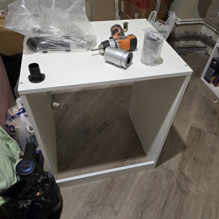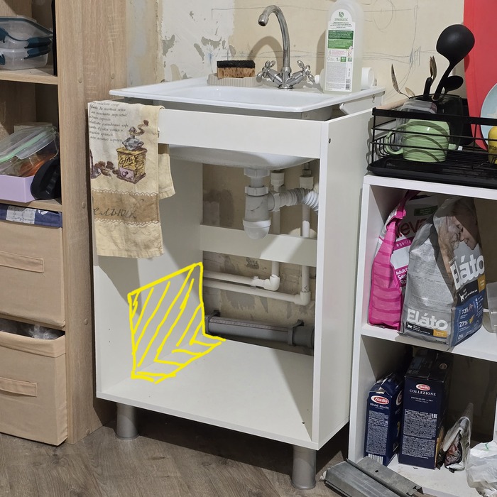 Тумбу под мойку придётся резать. Она не становится вплотную к стене, мешают трубы. Отрезать нужно прилично. Кусок 30х20 от левой стенки, 30х15 от дна, плюс перенести заднюю левую ножку. Возможно, укреплять дополнительно левую стенку, после того, как откочерыжу почти половину стенки.