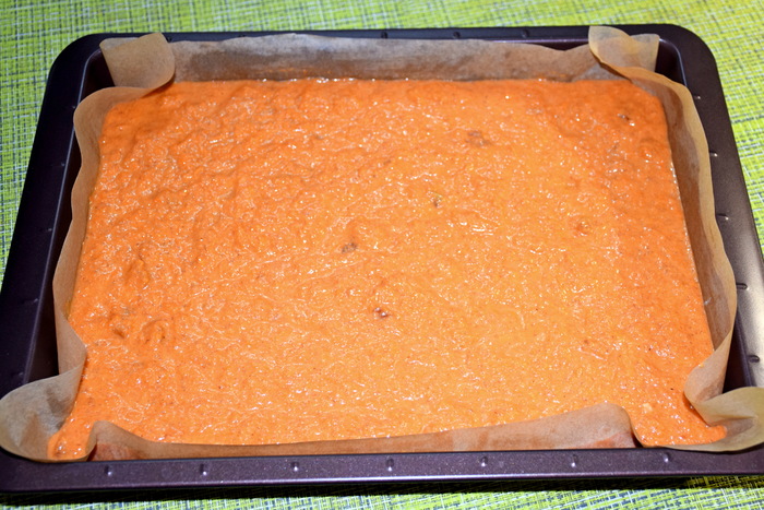 Шаг 5: Пора запекать коврижку. Застилаем противень пергаментом. Выкладываем тесто и размазываем его в прямоугольную форму толщиной 1 см.