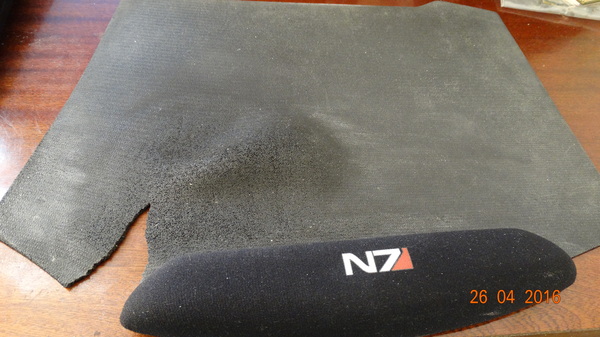 Я сделал скос со стороны торца, который после установки будет смотреть на меня. Прямой угол как-то не торт. Следующий этап - выбираем ткань. Тут нужно учесть пару факторов. Для начала - мышь должна хорошо ездить по ней, проверяем это заранее. Ещё желательно чтобы ткань была пропитана и не промокала, будет проще протирать, да и чай/кофе/потанцуем. У меня был кусок вот такой вот тряпки: