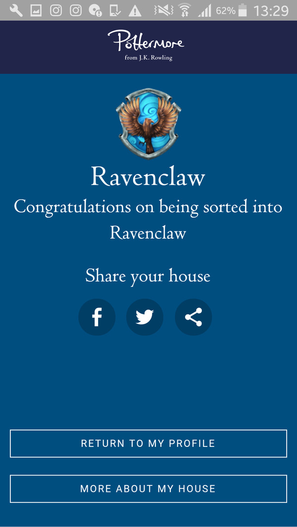 Небольшой пост о моём любимом факультете в школе чародейства и волшебства "Хогвартс". Думаю,можно излагать все свои мысли. Меня очень огорчает то, что многие люди знают Поттериану по фильмам... Почему я думаю , что Когтевран ммм... Лучше остальных факультетов? (Не обижайтесь. Это моё личное мнение) Может, потому-что сама считаю что попаду именно сюда ? В своей семье я-самая храбрая. Пойду на те аттракционы в парке, от которых у старших братьев отвиснет челюсть. Но та ли эта храбрость? Не думаю. Если бы мне предложили пережить то, что пережил Гарри, я откажусь. Я-неженка. Представляю как Поттер ломал зубы, кости, ноги, руки... Падал с огромной высоты, испытывал на себе непростительные заклятья... У меня только от мысли мурашки по коже. Когда я катаюсь на аттракционах в парке... Я же прекрасно понимаю, что всё застраховано, что я не упаду, не разобьюсь. А в битве за Хогвартс... Это совершенно другое. Я бы осталась. В этом я уверена. Но... Лучше сидеть в западне тщательно продумывая план действий по "Когтеврански", чем лезть в самое месило битвы по Гриффиндорски. Спасибо, что прочитал этот пост. =