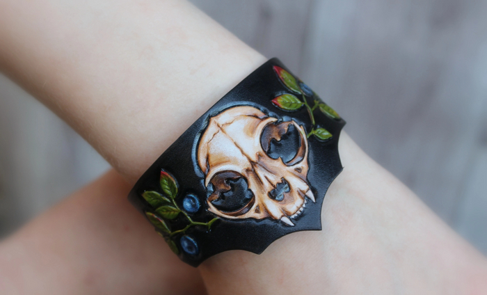 Рисунок выполнен в технике карвинг, окрашен профессиональными проникающими красками для кожи(не стираются и не линяют).