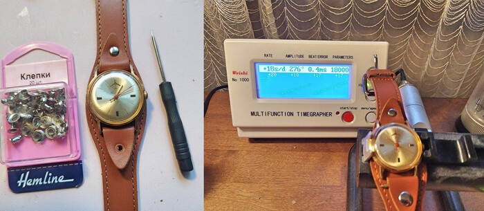Отреставрированные часы настраиваем на таймографе (приборе измеряющем суточный ход часов и иные параметры хода), после чего помещаем на напульсник, правда приходиться чуток сдвинуть пели, поставив новые заклепки.