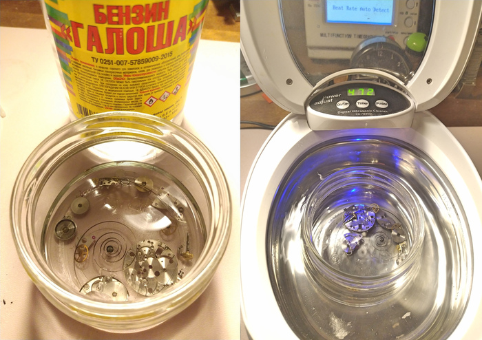 Снимаем стрелки и циферблат с механизма и убираем. Далее разбираем механизм и отправляем детали мыться в баночку с Бензином Калоша в УЗМ (ультразвуковая моющая ванна).